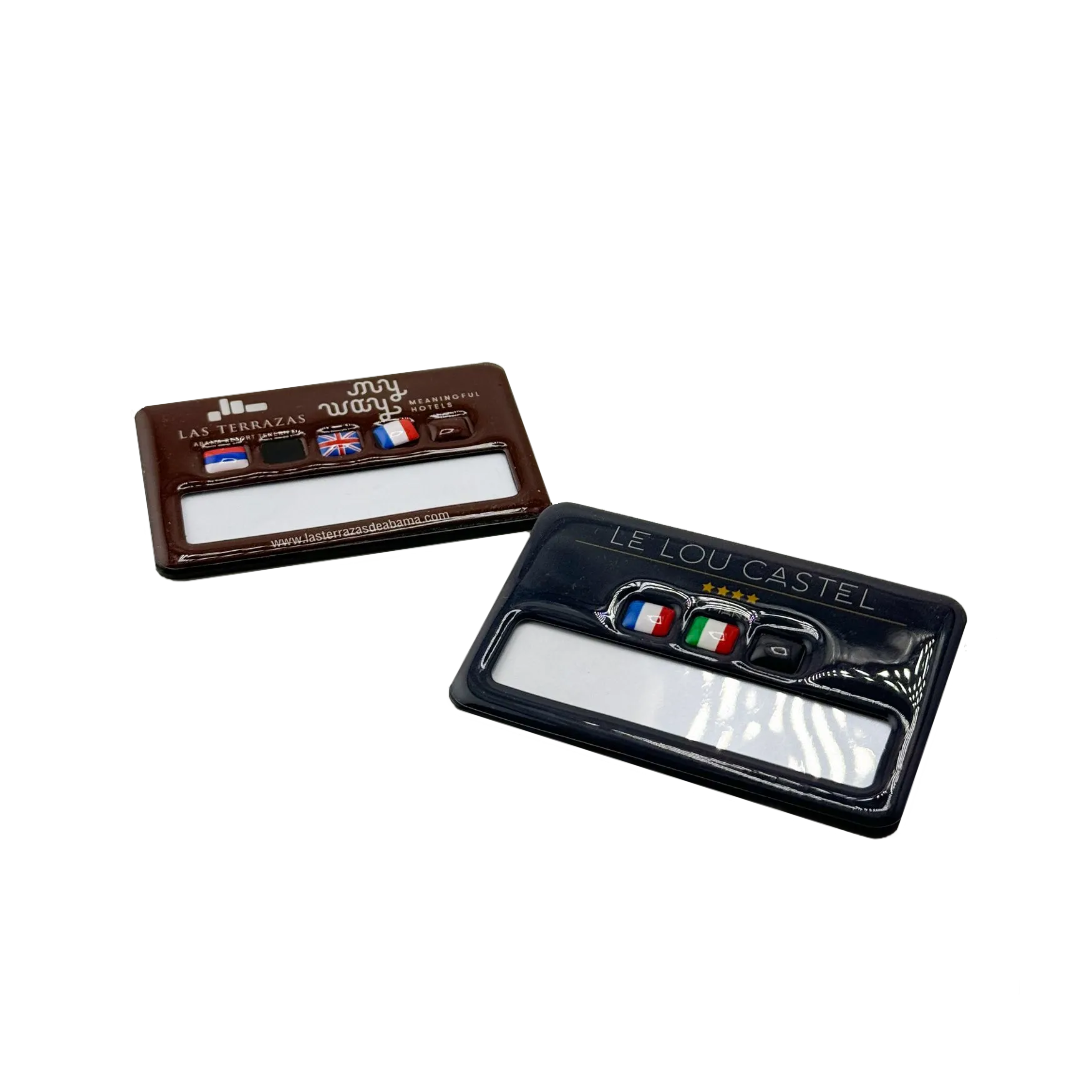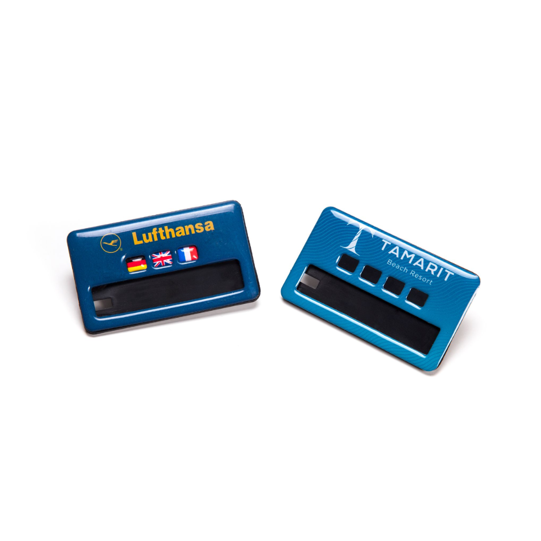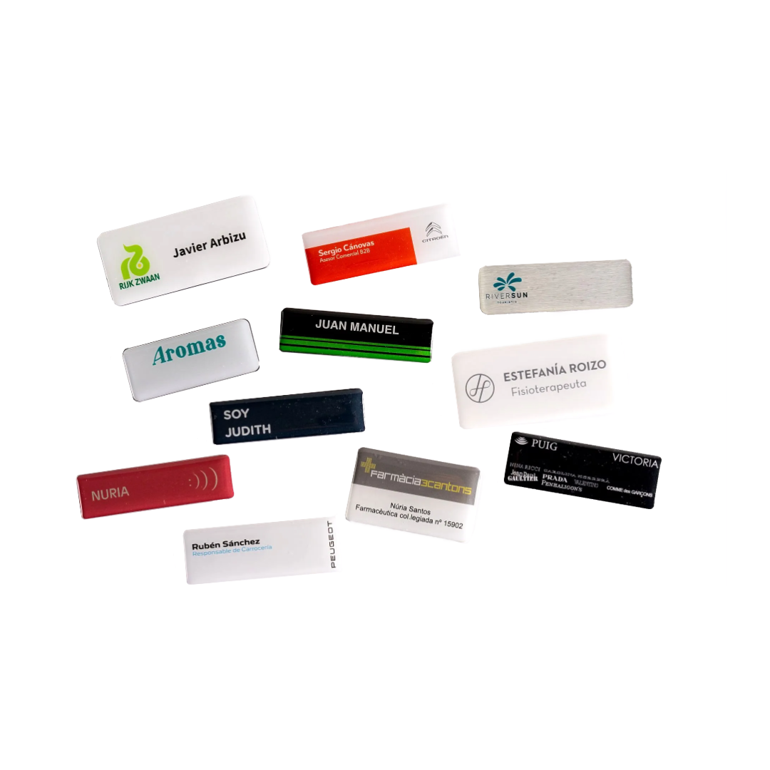 Nuestra tecnología de vanguardia ofrece un inigualable nivel de personalización que permite incluir la información que quiere en su identificador, diseños de alta calidad. Cada identificador se fabrica de forma individual. Podemos incluir gráficos como logotipos, imágenes o banderas de países. Ofrecemos el acabado con gota de resina y máximo brillo para darle a su identificador un aspecto y tacto exquisitos, adaptándonos por completo a su marca, reproduciendo o grabando cualquier tipo de fuente.