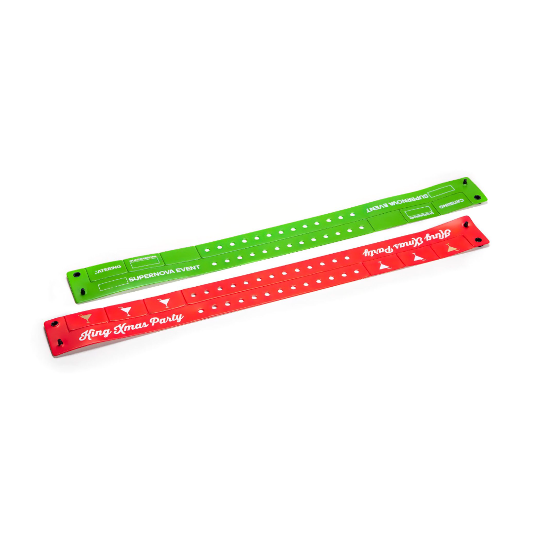 Pulseras de vinilo personalizadas de doble capa son totalmente intransferibles, ya que incorporan un cierre especial de un solo uso. Están disponibles en una gran variedad de colores y se pueden servir neutras o personalizadas en serigrafía. Estas cuentan con unas pequeñas ventanas que cuentan las consumiciones.